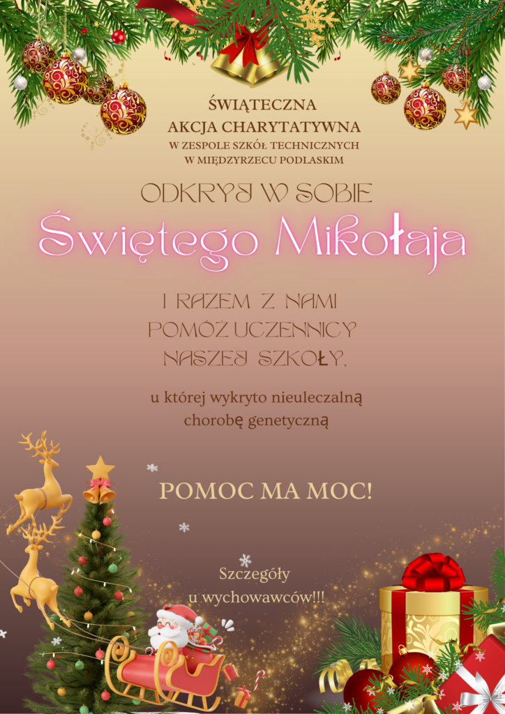 Drodzy Rodzice i Uczniowie, zachęcamy do wzięcia udziału w świątecznej akcji charytatywnej na rzecz uczennicy naszej szkoły, u której wykryto nieuleczalną chorobę genetyczną. Wszelkich informacji udzielają wychowawcy.