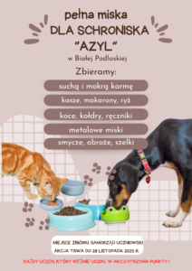 Drodzy uczniowie, serdecznie zachęcamy Was do wzięcia udziału w zbiórce rzeczy dla bezdomnych zwierząt 🐶🐱 przebywających w schronisku „Azyl” w Białej Podlaskiej, które szczególnie w okresie zimy potrzebują naszej pomocy. Z góry dziękujemy za okazaną pomoc ❤️
